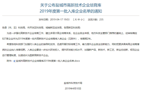 高新技术企业认定是对公司在自主知识产权、科技成果转化能力、研究开发组织管理水平、企业成长性指标和人才结构等多方面进行综合评估和认定,需经过层层筛选,此次能够成功入库盐城市2019年度第一批高新技术培育库,说明公司在研发创新方面已得到科学技术局的充分肯定和认可。