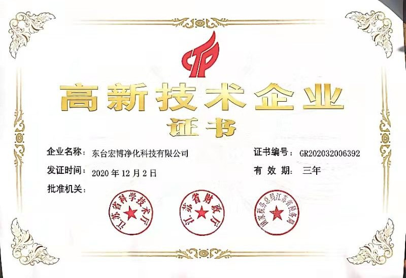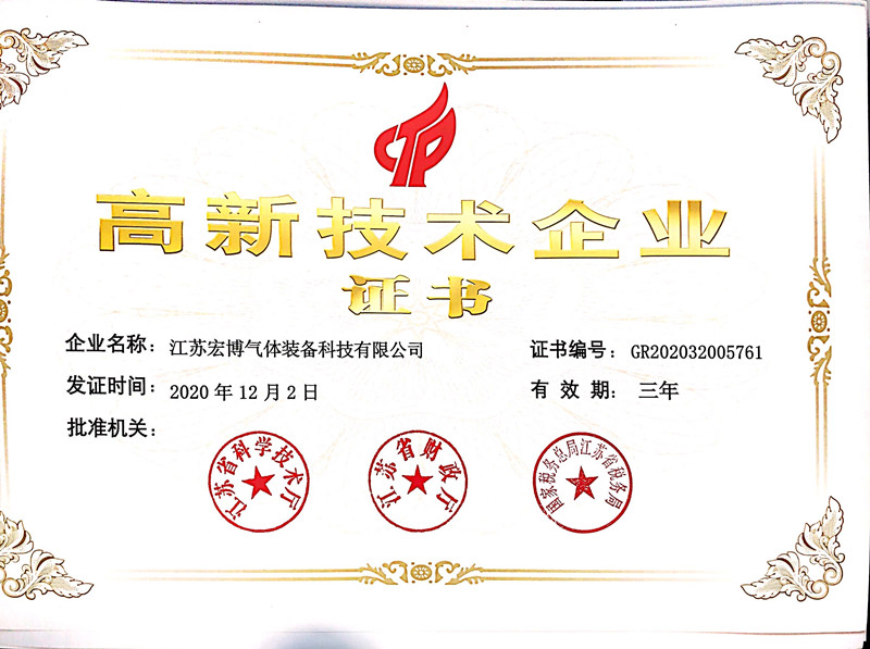 2020年,宏博企业江苏宏博气体装备科技有限公司,生产基地-东台宏博净化科技有限公司同时获评高新技术企业,并于近日收到由江苏省科学技术厅、江苏省财政厅、国家税务总局江苏省税务局联合颁发的《高新技术企业证书》。