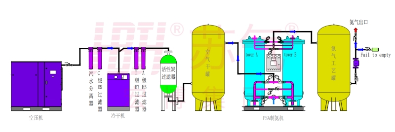 环境空气经压缩净化,除去油、水、尘后,进入由两个装填有碳分子筛的吸附塔组成的变压吸附装置。压缩空气由下至上流经吸附 塔,其间氧分子在碳分子筛表面吸附,氮气由吸附塔上端流出,进入粗氮缓冲罐,经过一段时间后,吸附塔中碳分子筛被吸附的氧饱和,需进行再生。再生是通过停止吸附步骤,降低吸附塔压力来实现的。两个吸附塔交替进行吸附和再生,从而确保氮气的连续输出。
