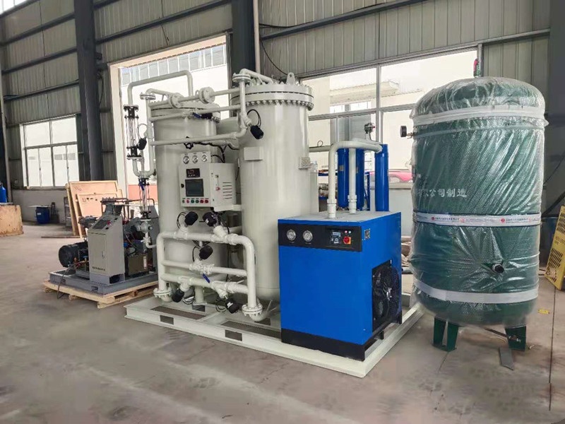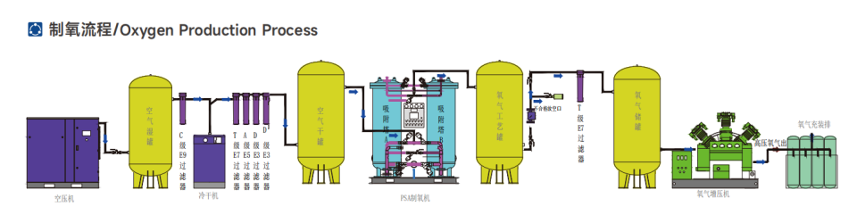 变压吸附制氧装置以洁净的压缩空气为原料,采用高品质的沸石分子筛作为吸附剂,在一定的压力下,从空气中制取氧气。经过纯化干燥的压缩空气,在吸附器中进行加压吸附、减压脱附。由于空气动力学效应,氮在沸石分子筛微孔中扩散速率远大于氧,氮被沸石分子筛优先吸附,氧在气相中被富集起来,形成成品氧气。然后经减压至常压,吸附剂脱附所吸附的氮气等杂质,实现再生。一般在系统中设置两个吸附塔,一塔吸附产氧,另一塔脱附再生,通过PLC程序控制器控制气动阀的启闭,使两塔交替循环,从而取得纯度较高的氧气(93%±3%)。
