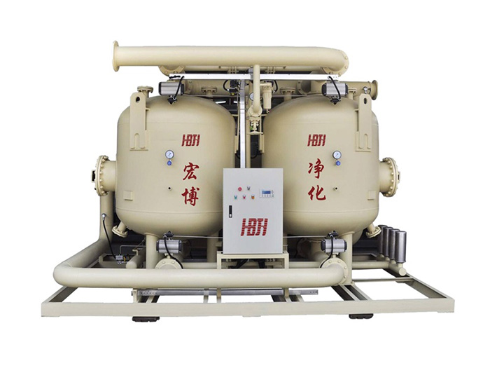 压缩热零气耗吸附式干燥机,是利用空压机排气的高温热能对吸附剂进行深层脱附再生,取消了外置电加热器,加热时无再生气耗,冷却时高温压缩空气经过二级冷却器冷却后再次对吸附剂进行冷却,使得吸附剂具备吸附条件,运行过程中无压缩气体排放,是较节能的吸附式干燥机。